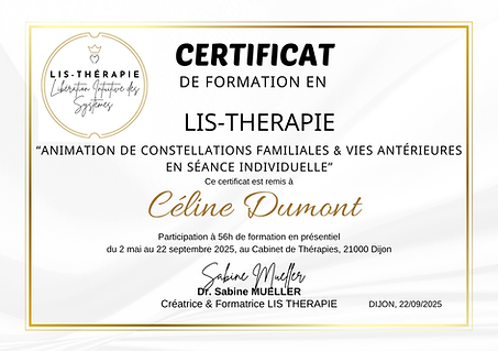 La "LIS-THERAPIE" (Libération Intuitive des Systèmes et leurs Mémoires) désigne ma façon de travailler avec les constellations systémiques (familiales, professionnelles, et des vies antérieures) en séance individuelle qui est le fruit de mon expérience professionnelle (plus de 1000 séances individuelles réalisées depuis 2018). Basée sur les principes des constellations familiales (Bert Hellinger), j'accorde une place importante aux dimensions suivantes:
